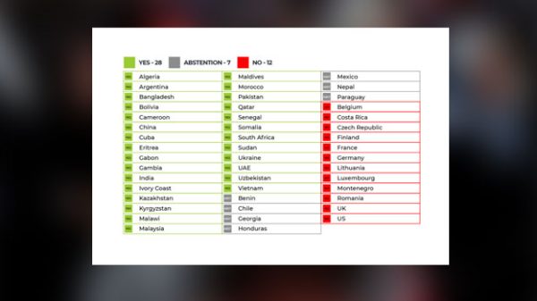 ধর্মীয় বিদ্বেষবিষয়ক প্রস্তাবটির পক্ষে ভোট দেয় বাংলাদেহসহ ২৮টি দেশ। বিপক্ষে ভোট দেয় ১২টি দেশ। আর ভোট দানে বিরত ছিল ৭টি দেশ।