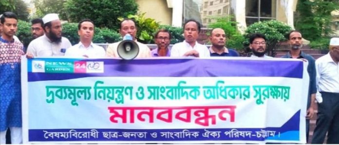 বৈষম্য বিরোধী ছাত্র জনতা ও সাংবাদিক ঐক্য পরিষদের উদ্যোগে দ্রব্যমূল্য নিয়ন্ত্রণ ও সাংবাদিক অধিকার সুরক্ষায় মানববন্ধন আজ ২৭ অক্টোবর (রবিবার) বিকাল ৪ টায় চেরাগী মোড়ে সংগঠনের আহ্বায়ক কামরুল হুদার সভাপতিত্বে ও পরিষদের সদস্য সচিব এবিএম ইমরান’র পরিচালনায় অনুষ্ঠিত হয়।