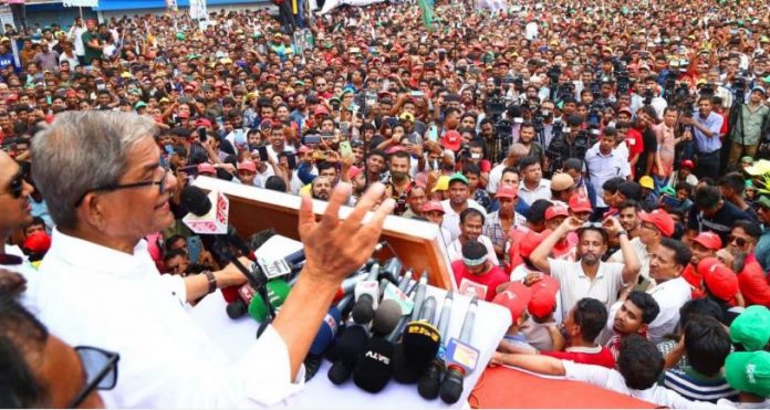 সমাবেশে তরুণদের উদ্দেশে মির্জা ফখরুল বলেন, ‘যে বাংলাদেশকে একসময় বলা হতো উন্নয়নের রোল মডেল, সেই বাংলাদেশকে এখন বলা হচ্ছে মরীচিকা। বরিশালের নির্বাচনে চরমোনাই পীরকে হারিয়ে দেওয়া হয়েছে। তার গায়ে হাত তোলা হয়েছে। মেরে রক্ত বের করে দিয়েছে। আজ স্বাধীনতাকে রক্ষা করার সময় এসেছে। স্বাধীনতা আজ বিপন্ন। বাংলাদেশের মানুষের ভবিষ্যৎ আজ বিপন্ন। এই বাংলাদেশকে রক্ষা করতে হবে। তরুণ, যুবক, ছাত্রদের এগিয়ে আসতে হবে। এই সরকার জোর করে ক্ষমতায় বসে আছে। তারা জনগণের ওপর স্টিম রোলার চালাচ্ছে।’